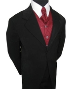 Chaqué rojo Mod 2-01 compuesto de 5 piezas : Chaqueta y pantalón negro, camisa blanca , chaleco y corbata roja estampada.
