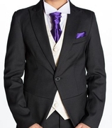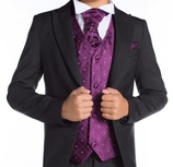 Chaqué negro Mod 2-47 compuesto de 5 piezas : Chaqueta y pantalón negro, camisa blanca , chaleco y corbata morado oscuro.