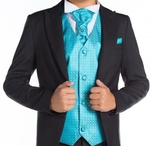 Chaqué negro Mod 2-52 compuesto de 5 piezas : Chaqueta y pantalón negro, camisa blanca , chaleco y corbata turquesa.