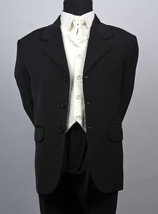 Chaqueta y pantalón negro, camisa y chaleco crudo , corbata cruda estampada.