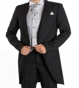 Chaqué negro Mod 2-37 compuesto de 5 piezas : Chaqueta y pantalón negro, camisa blanca , chaleco y corbata plateada.