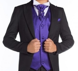 Chaqué negro Mod 2-47 compuesto de 5 piezas : Chaqueta y pantalón negro, camisa blanca , chaleco y corbata morado oscuro.