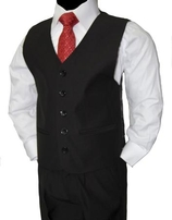 Traje clásico Mod 2-03 compuesto de 5 piezas : Chaqueta ,pantalón y chaleco negro , camisa blanca ,corbata estampada roja.
