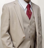 Traje Beige Mod 02-21 compuesto de 4 piezas : Chaqueta , chaleco y pantalón beige, corbata estampada emblema cáliz.